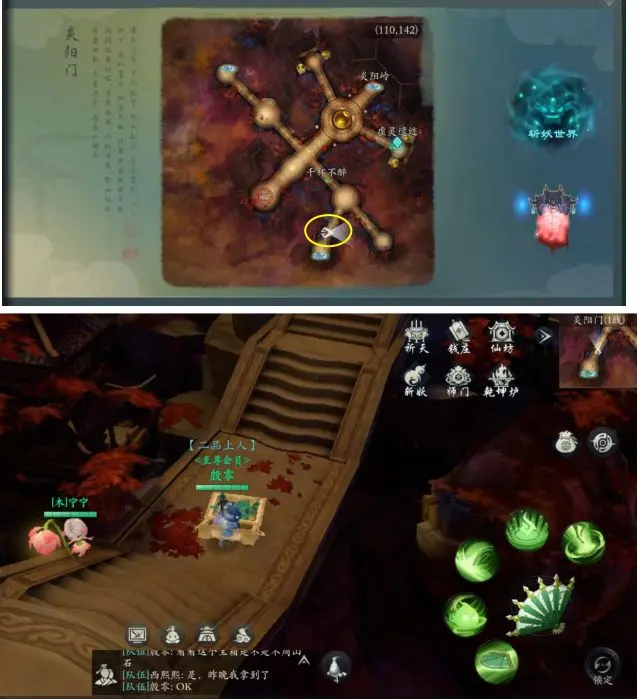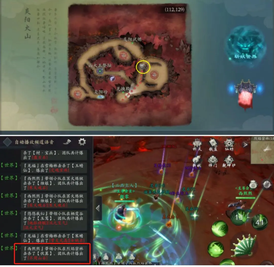炎阳大山——(黄圈,等两人聊完天,出现传送门)烈焰密林——伏翼首杀,不周山石
