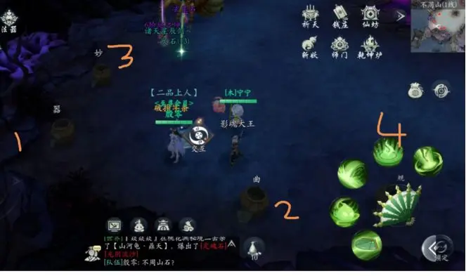 按照图中1234顺序打罐子,出现幻蛛,击杀后,出现宝箱,不周山石