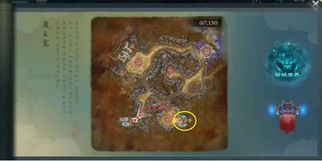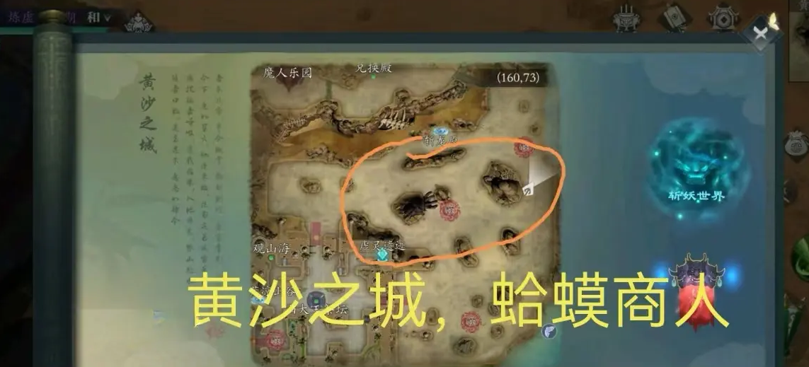 黄沙之城——(红圈)沙漠洞穴——(打完BOSS出现传送门)黄沙老祖幻境——开宝箱,不周山石