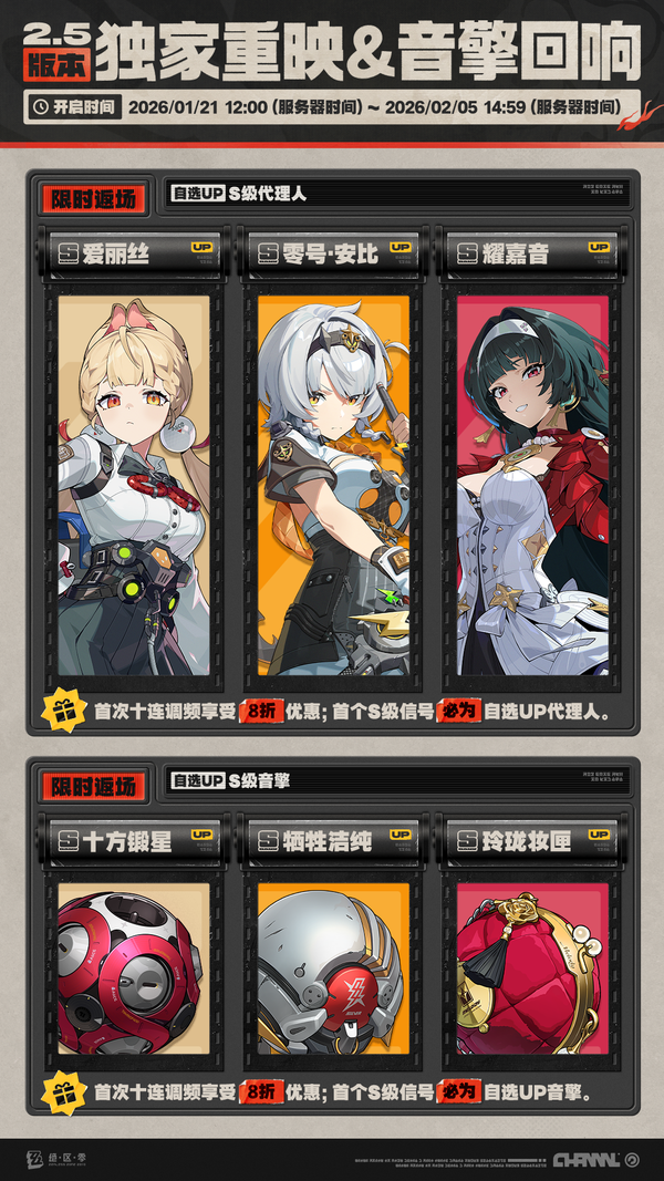 绝区零独家重映活动时间与自选范围,在本期频段中,可自选的限定S级代理人包含:[爱丽丝(物理·异常)]、[零号·安比(电·强攻)]、[耀嘉音(以太·支援)]