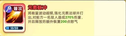 将能量波动超频,强化元素法球并打出,对前方一名敌人造成270%伤害,并且释放后额外恢复200点怒气