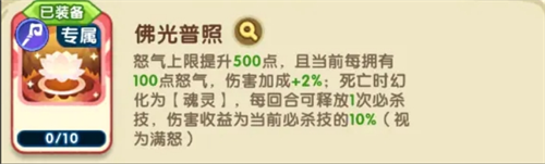 怒气上限提升500点,且当前每拥有100点怒气,伤害加成+2%;死亡时幻化为[魂灵],每回合可释放1次必杀技,伤害收益为当前必杀技的10% (视为满怒)