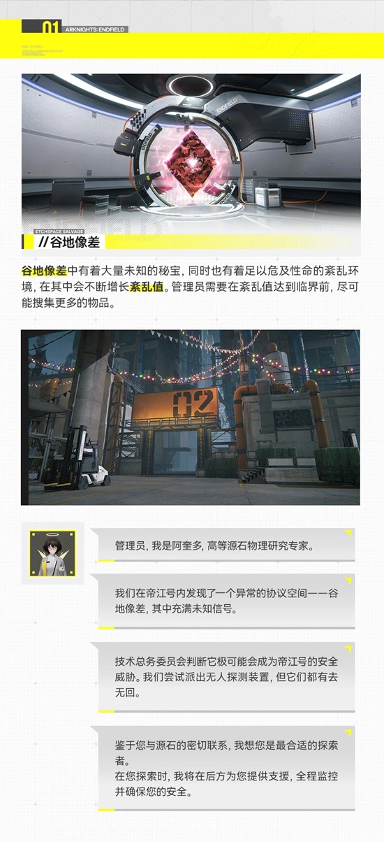 明日方舟:终末地「蚀像寻遗」玩法介绍来了~危机与珍宝,偏差与演化……请在足以危及性命的紊乱环境中一探究竟吧,管理员。谷地像差中有着大量未知的秘宝,同时也有着足以危及性命的素乱环境,在其中会不断增长紊乱值,管理员需要在紊乱值达到临界前,尽可能搜集更多的物品。