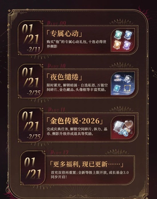 ✦夜色缱绻✦限时累充,领取暗涌 · 自选私语、万能空间碎片、金色藏品等高价值奖励。