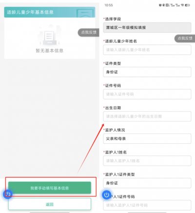 5.在适龄儿童少年基本信息页面,若无基本信息,需要根据指引手动填写基本信息,完成“填报信息”—“登记报名”流程即可。具体流程参考文末流程图。