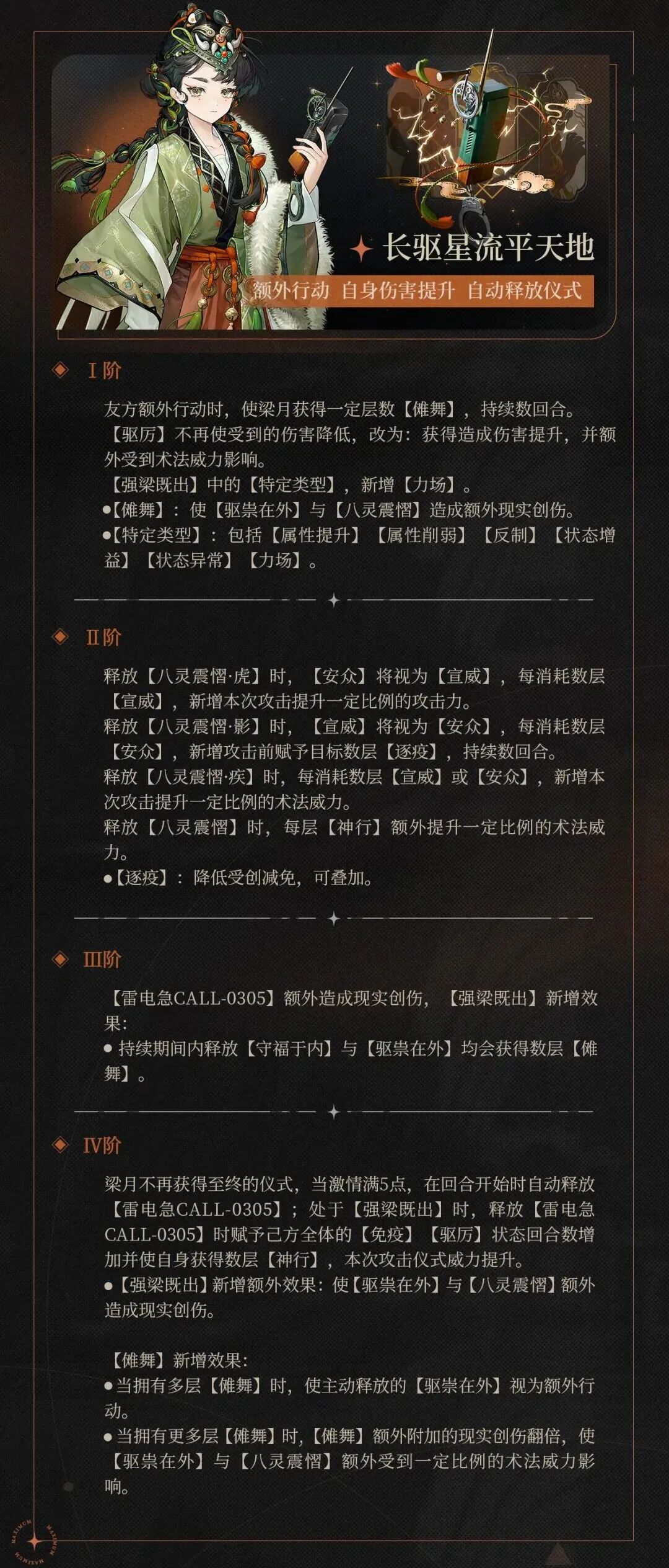 梁月狂想后新增傩舞机制,友方额外行动或者强梁既出状态下释放1、2技能可以叠层:傩舞可以提供以下效果: