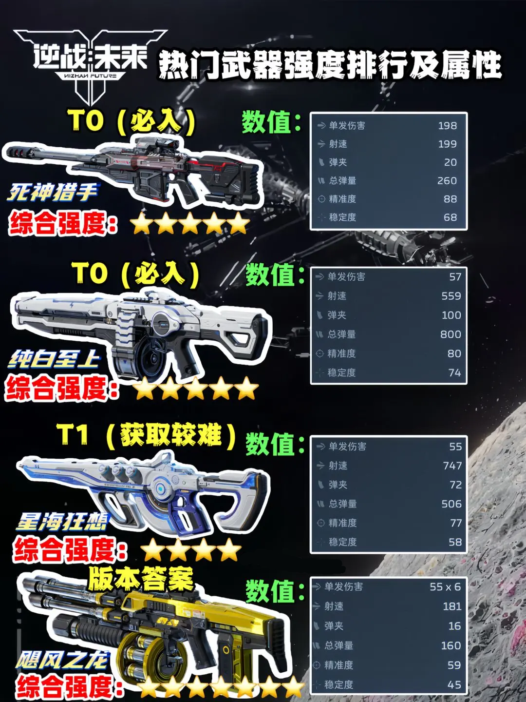 在逆战未来中,有着丰富的武器装备能够选择和使用,每种武器都有不同的数值和性能,玩家能够根据自己的需求来选择和使用,今天将为大家带来逆战未来武器强度榜分析一览,供有需要的玩家进行参考。