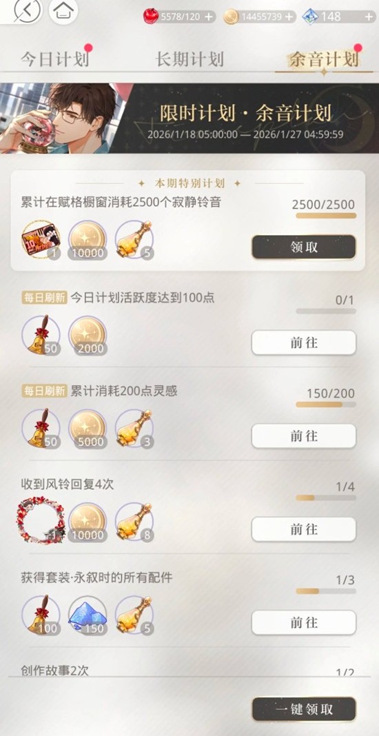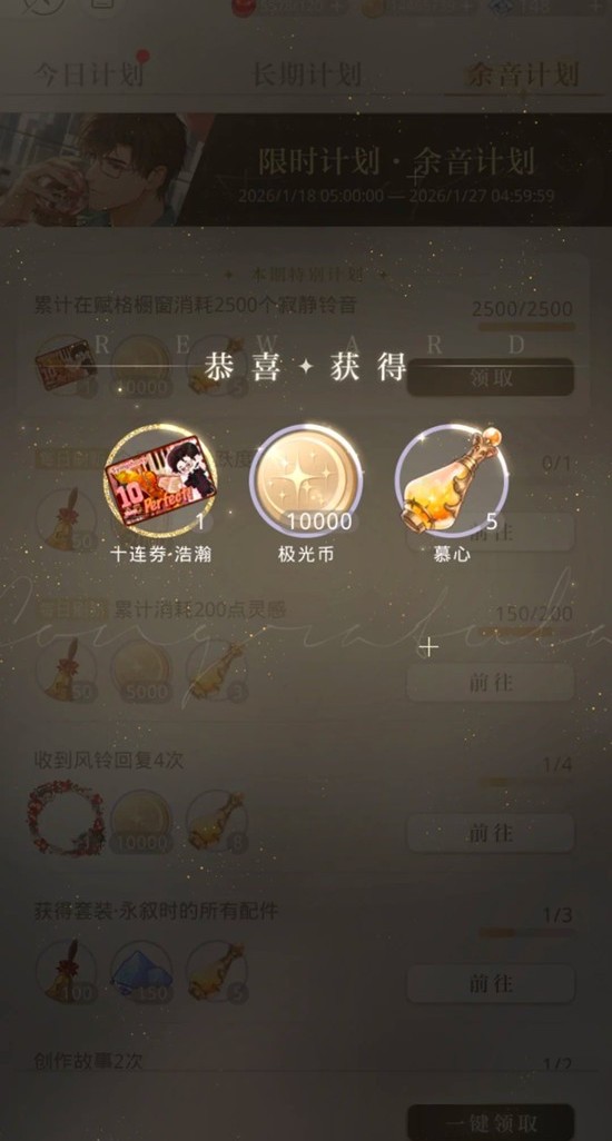 今日可进行1次创作故事,10次心曲和弦关卡,收到1次风铃回复,解锁剧情一次。