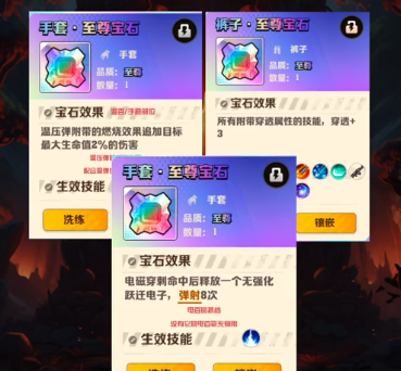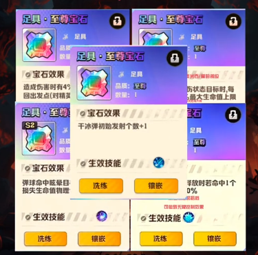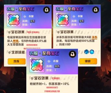 电百是电磁穿刺的核心宝石;冻伤宝石180关前可以留,后面有了二四代干冰皮这个宝石可以洗掉;枪械齐射是枪的核心宝石,留个红色品质的就好