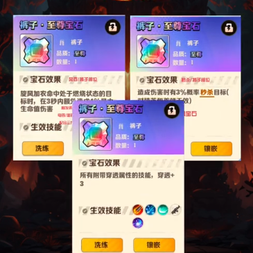 洗到或者是合到空百和技能头选一定要留,空百打火爹的克星,卡在180关往后的火爹关卡;技能头选也是战略价值非常高的一个宝石;激光冷却宝石也要留好作为备选缩减激光冷却时间,出现百伤前中期可以过渡一下。