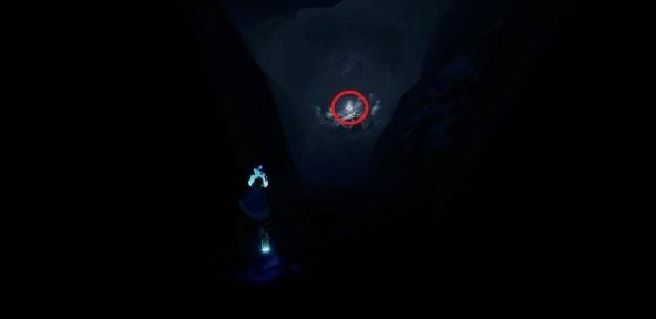 从上一个跳跃点左侧的水母跳到远处的门廊,进入区域后沿着骨头走到水源点,贝壳就在水源点正上方的头骨内。