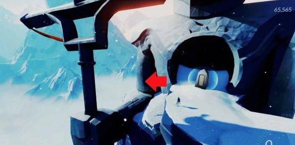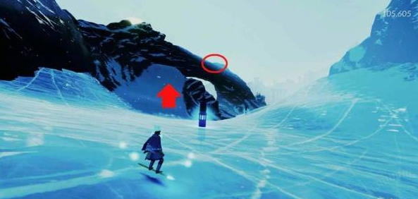 在同一个位置往回看拱形石头,从左侧雪坡加速跳到拱形石头顶部即可看到贝壳。