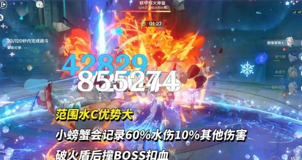 2、场地持续生成重甲蟹,破重甲蟹火盾后,蟹会撞向BOSS,扣除BOSS火护甲,并附带期间60%水伤+10%其他伤害的额外扣血。