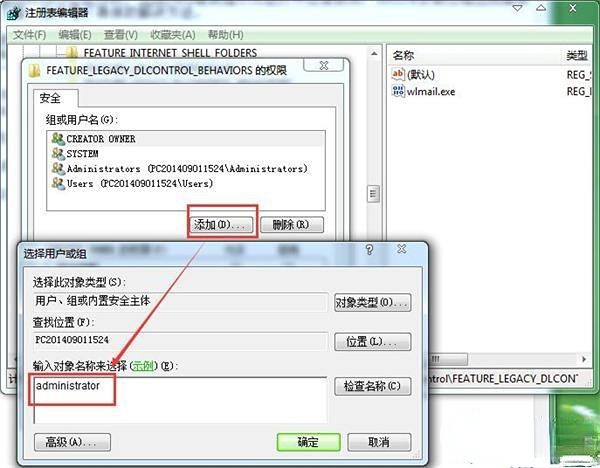 4、随后我们点击权限,然后点击添加,输入administrator,最后点击确定完成添加。