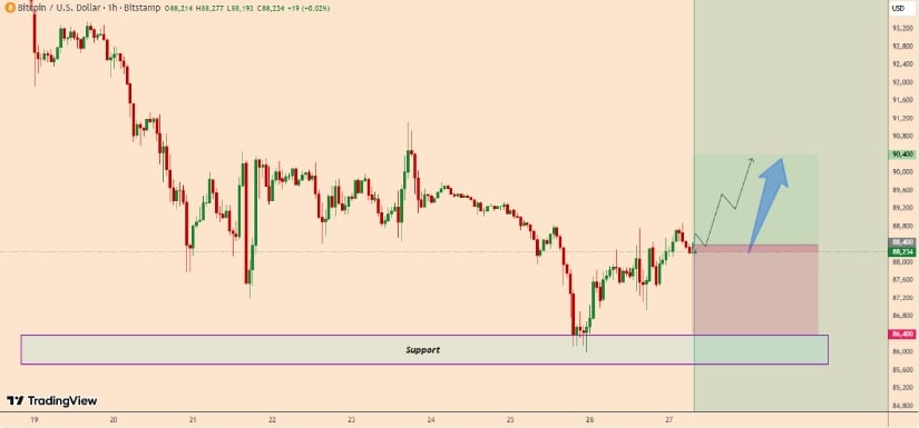 比特币从86,400美元反弹后站稳88,300美元上方,暗示可能上探89,800-90,400美元区间。来源:TradingView用户Stevenexpert540