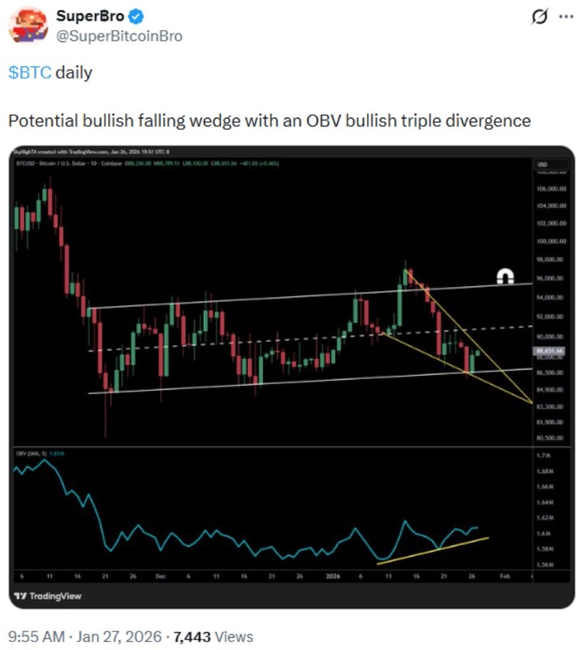 比特币的下降楔形与OBV背离预示潜在突破,但若支撑失效可能下探83,000美元。来源:Super฿ro通过X平台发布