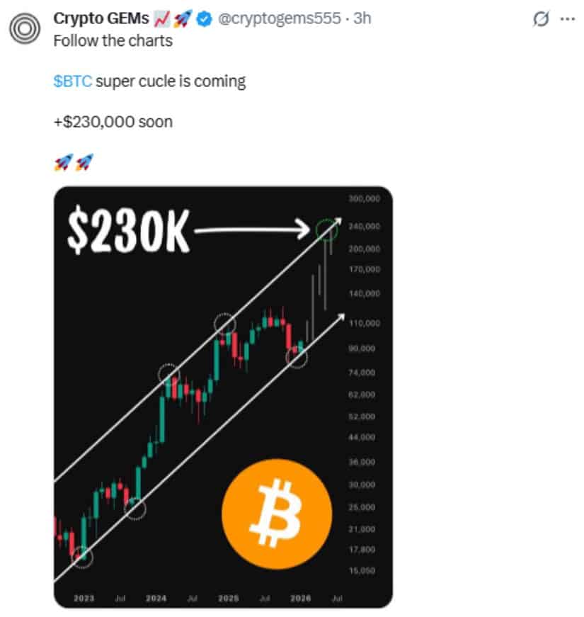 比特币从2023年15,000美元起步,在减半效应与机构资金推动下2026年或触及230,000美元,但预测仍存不确定性。来源:Crypto GEMs通过X平台发布