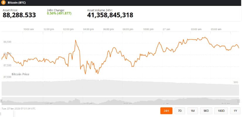 截至发稿,比特币交易价格约为88,288.533美元,24小时涨幅0.56%。来源:Brave New Coin比特币价格数据