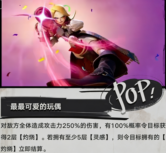 主动技能“最可爱玩偶”为范围型输出技,召唤玩偶发射导弹,对全体敌方单位造成伤害,最高倍率可达250%。命中后为目标附加两层灼烧效果;当灼烧层数累计达5层时,立即触发全额灼烧结算。