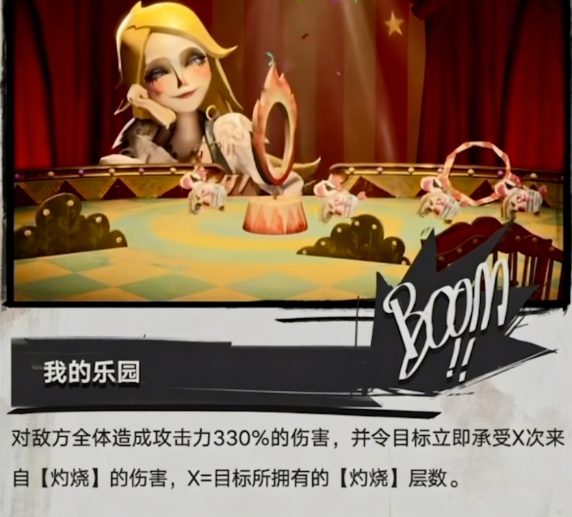 终极技能“乐园”可对全部敌人施加300%基础伤害,并依据实际命中敌人数额外叠加燃烧层数,每层均提升后续灼烧伤害总量。若场上存在对应羁绊关系,该技能还可激活“激昂”状态,触发一次额外追击伤害。