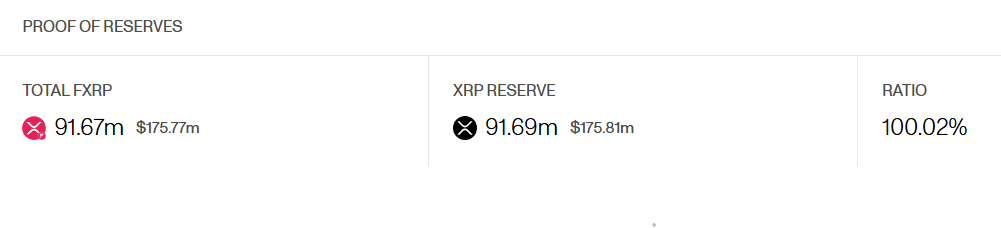 XRP 总储备量现为 9169 万枚(约 1.7581 亿美元),其中 FXRP 储备达 9167 万枚,维持 100.02% 的储备率。
