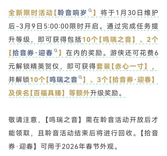 免费给10抽聆音道具,氪6的小战令再给10抽聆音道具、新外观、新春外观半价券(之前是蜀戏春)还有侠名!