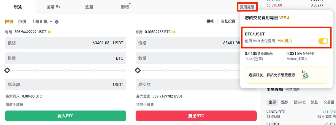 1. 您可以从现货交易页面启用或停用该功能。点选【费用等级】- 【使用BNB支付费用25%折扣】打开或关闭它。