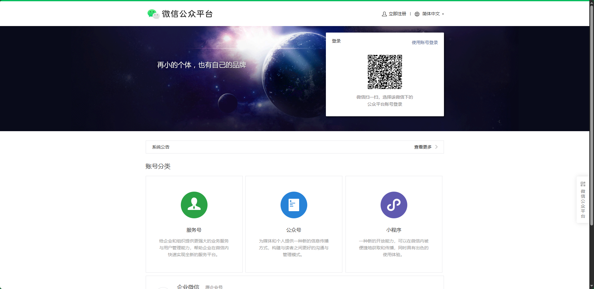 登录页面默认采用扫码登录方式,只需使用绑定公众号的微信扫描二维码并在手机端确认,即可快速完成验证。这种方式兼具安全性与便捷性,特别适合需要频繁登录的用户。