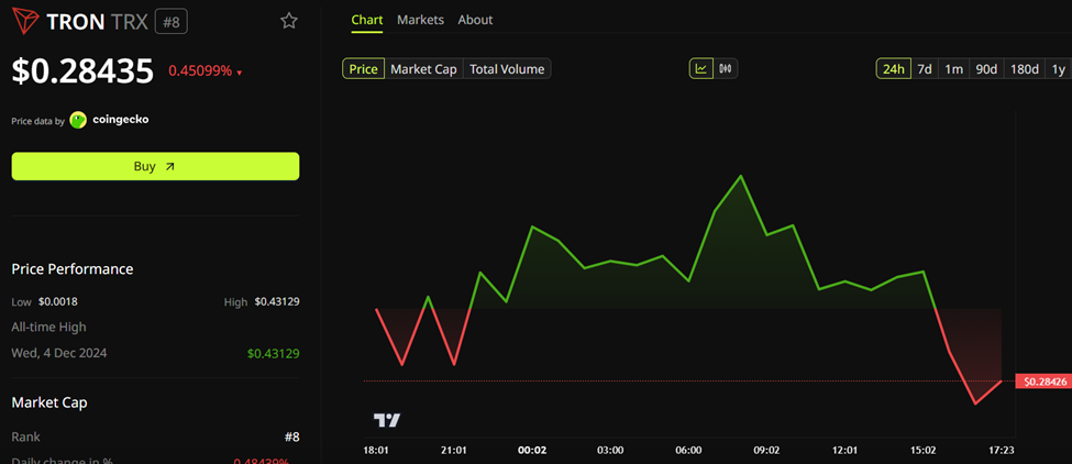 截至发稿,波场TRX代币报价0.2843美元,24小时微跌0.5%。