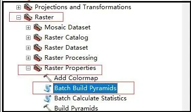 4、然后在下拉内容找到“Raster”点击,选择“Raster Properties”下方“Batch Build Pyramids”功能进入。