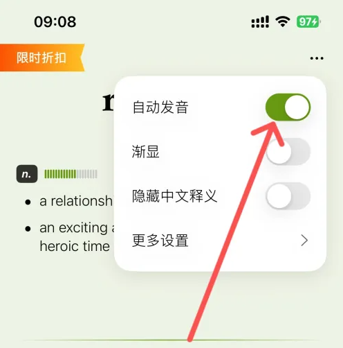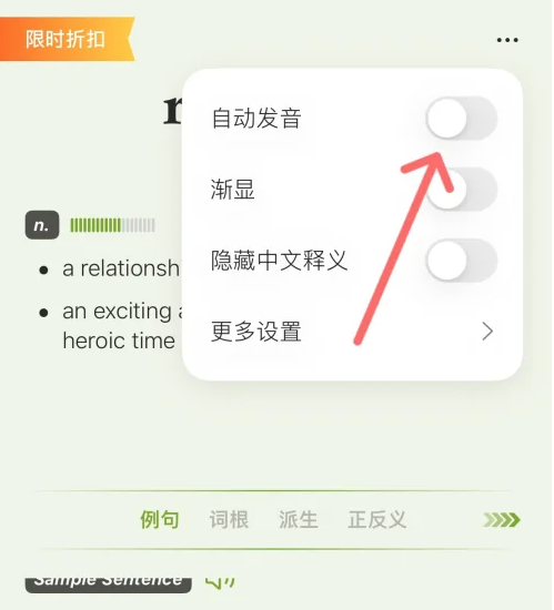 如下,展开的功能中,点击【自动发音】后的按钮