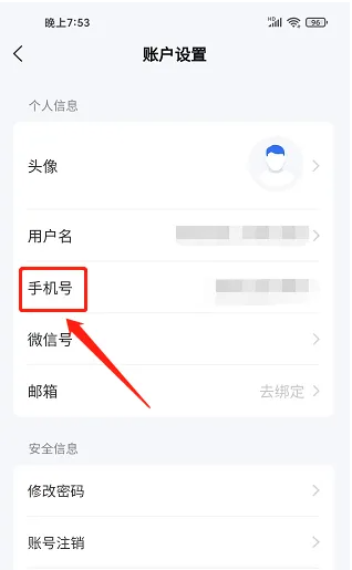 进入账户设置窗口,点击【手机号】。