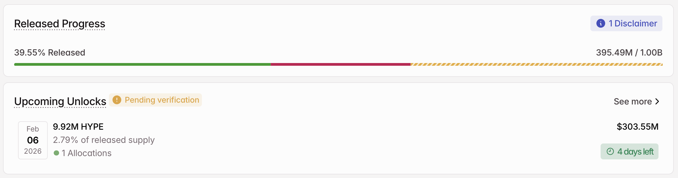 2月6日,项目方将解锁992万枚HYPE(价值3.0355亿美元),占当前流通量的2.79%。