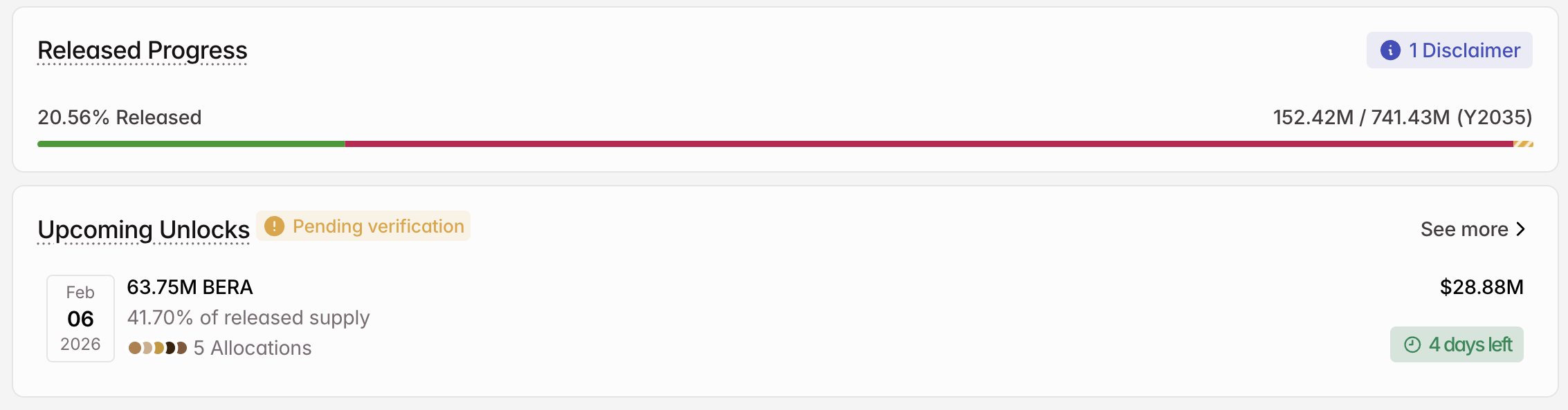 2月6日将解锁6375万枚BERA(约2880万美元),占流通量的41.70%。本次解锁代币将分为五个用途: