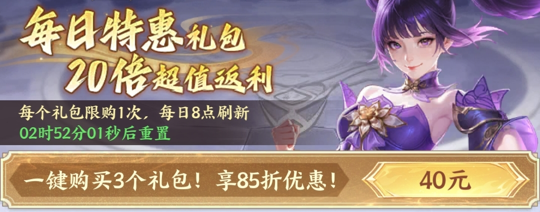 含1款免费礼包与3款付费礼包,一次性购齐3款付费礼包享85折优惠,折后总价40元。每日08:00刷新购买次数。