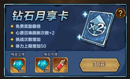 提供免费奖励翻倍、挑战次数+1、体力上限提升50点等增益效果;开通即赠300钻,每日还可领取150钻与6个【宝石洗炼道具】。