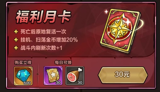 赋予死亡原地复活一次、挂机扫荡金币收益+20%、战斗内刷新次数+1三项实用特权;开通即得600钻,每日可领30张【召唤券】与30点【体力】。