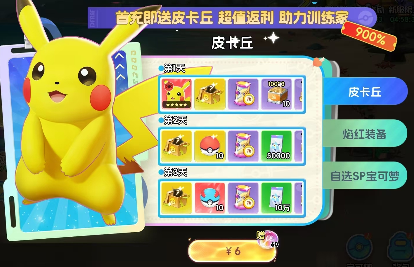 6元档:皮卡丘、金色装备、超级球、精灵球等基础养成资源