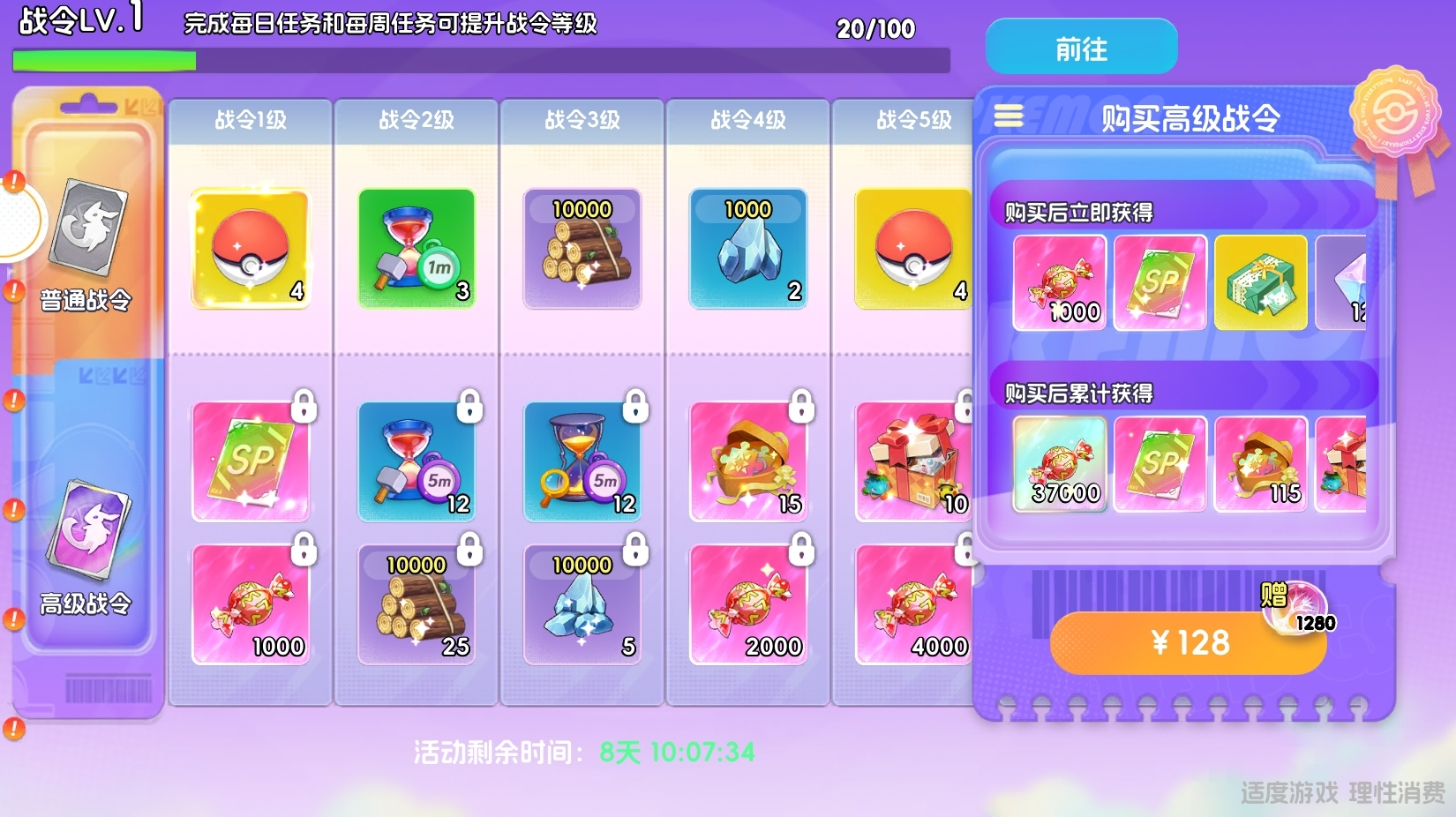 高级战令需128元激活,涵盖大量加速类道具、岛屿建设资源、宝可梦培养材料,并附赠一张SP宝可梦自选卡。