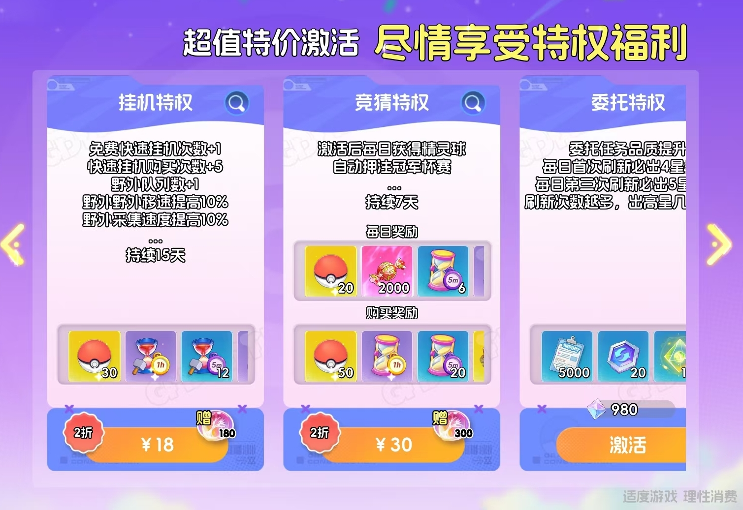 包含召唤特权(首充即开)、挂机特权(18元)、竞猜特权(30元)、委托特权(980宝钻)。激活后除享受对应功能加成外,还可领取专属激活礼包。