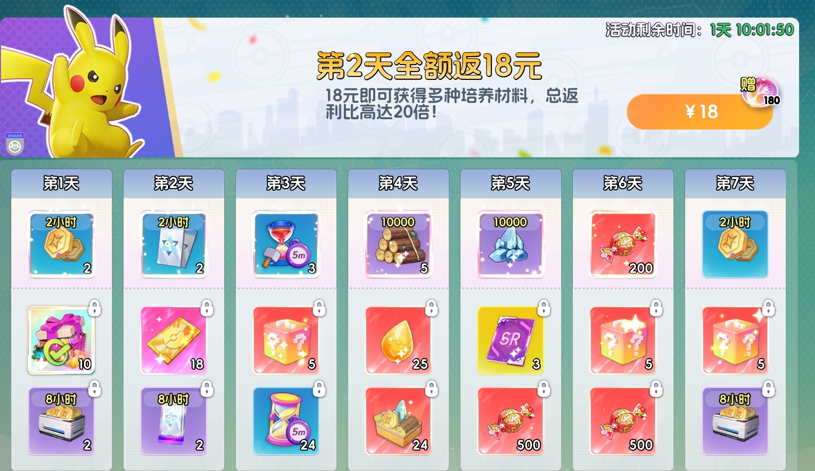 支付18元即可获得多类养成材料,且所付金额将以代币形式全额返还,实现零成本获取资源,属于必选项目。