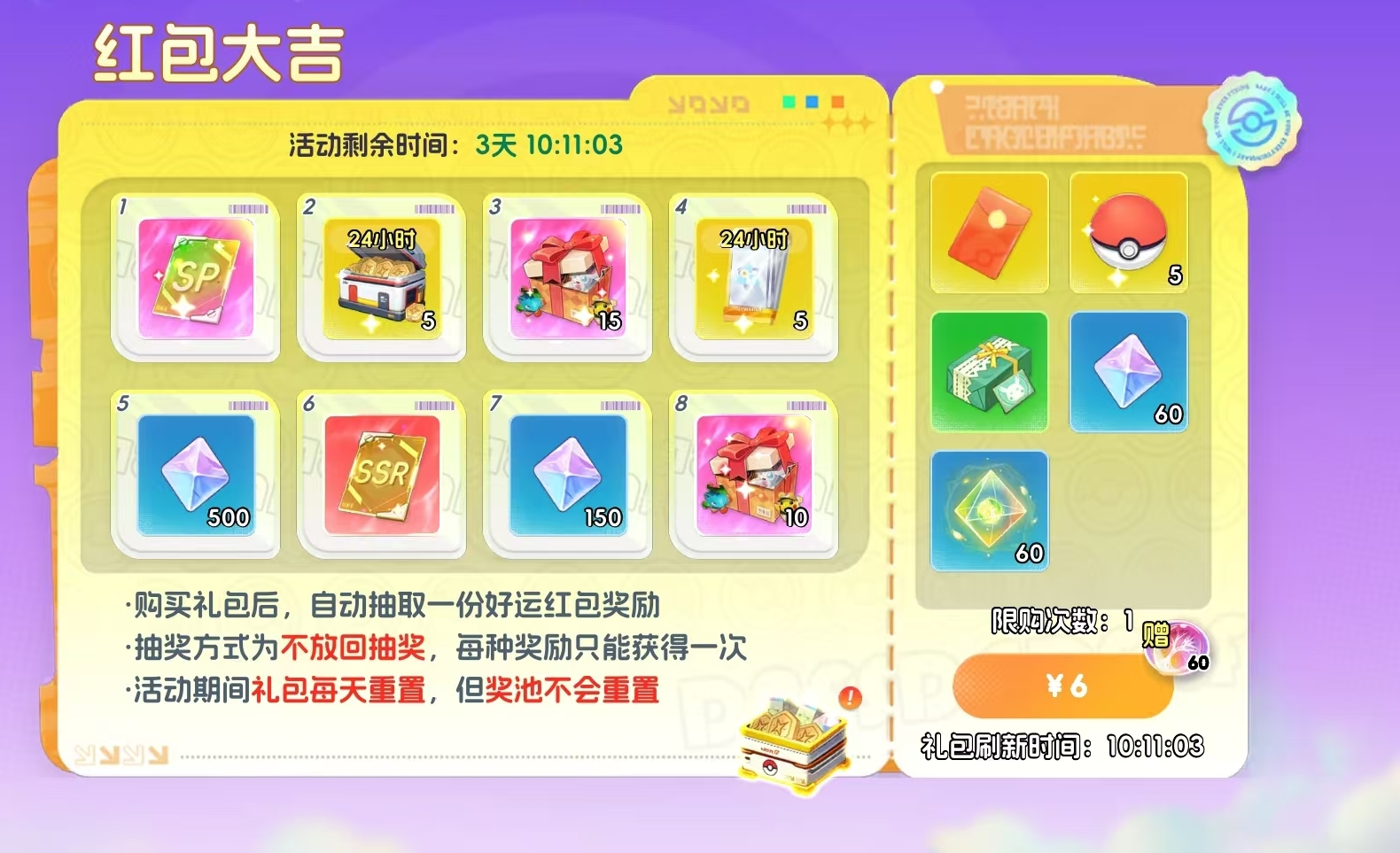 每日6元抽取好运红包,累计购买8次可清空奖池,奖池内含SP宝可梦自选卡。该机制投入可控、回报明确,竞技冲刺型与全服顶尖型玩家建议达成清空目标。