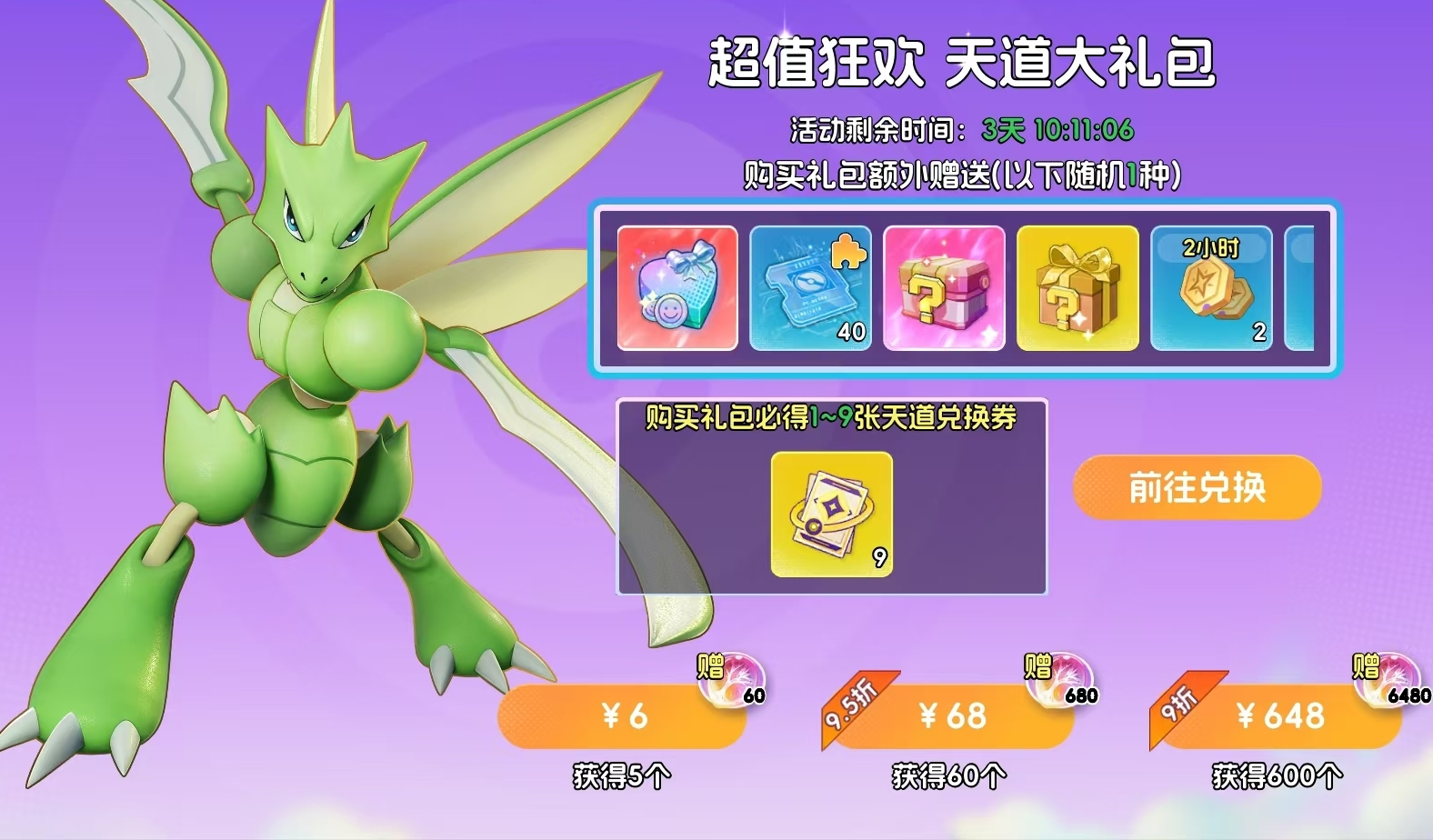 购买后可获得主城外观自选箱、随机藏品碎片、食物箱等资源,每份礼包额外产出1~9张天道兑换券。共设6元(5个礼包)、68元(60个礼包)、648元(600个礼包)三档。天道兑换券可在天道商店中兑换SP宝可梦自选卡、SSR宝可梦自选卡等关键道具,是解决升阶材料短缺的有效途径。