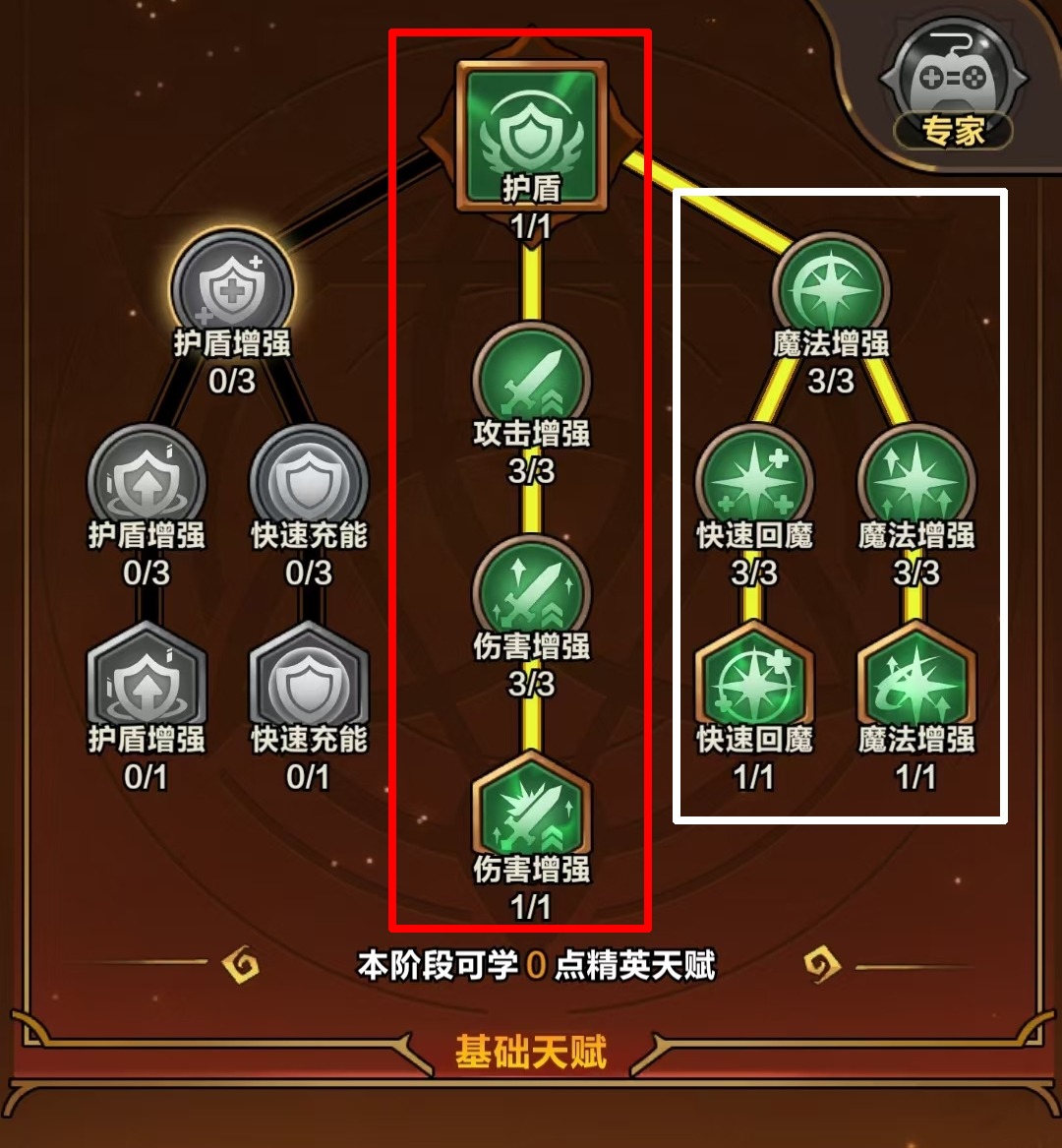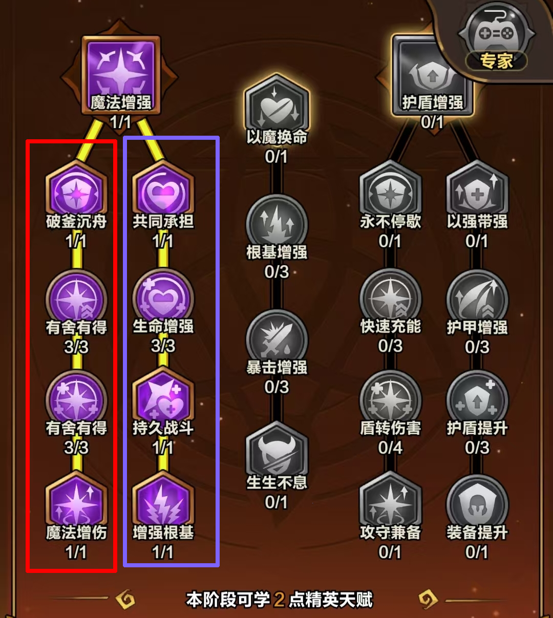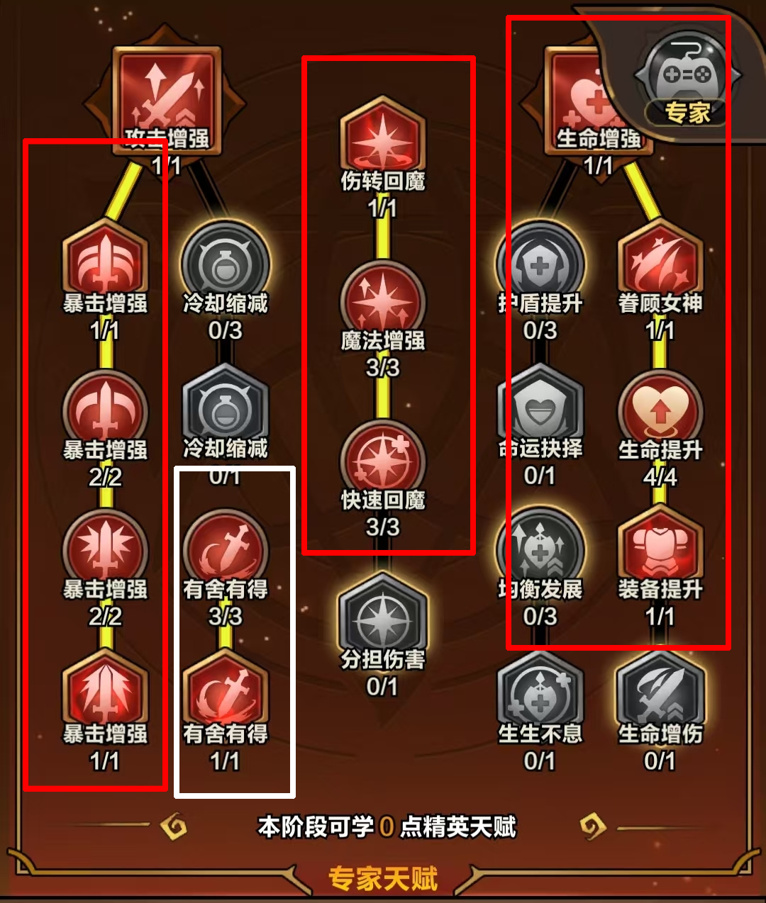 核心路径聚焦中间红色区域全点满。左侧白色区域暂不分配点数,待中期完成【魔法天赋】最左列全部节点后再开启补点。若后期资源紧张,可将中间底部三项天赋回退,将点数集中投向提升魔法值上限与恢复效率的关键节点,确保技能循环持续性优先于次要属性加成。
