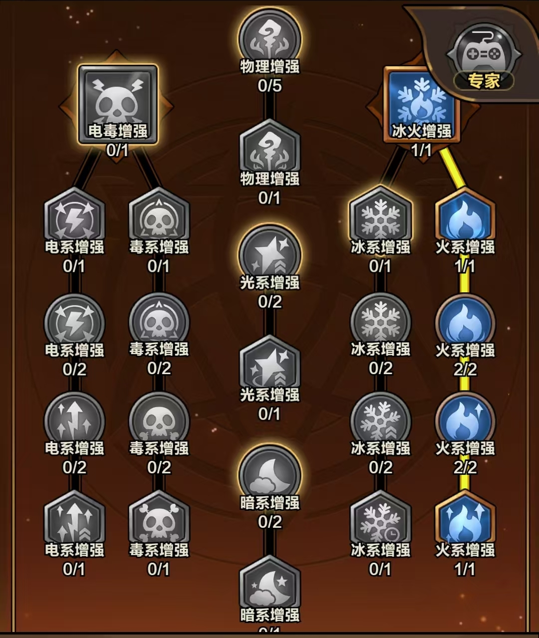 火、电、毒、冰四系玩家需激活对应元素分支中的增伤与特效强化节点;光、暗、魔法弹三类技能使用者仅需贯通中央列天赋,该路径提供跨元素通用的施法速度、暴击率与能量转化率加成。本模块完成后,立即返回【防御专精】补全白色区域,剩余点数可根据实战反馈自由调配。