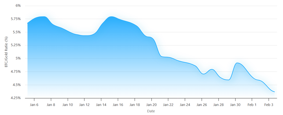 黄金与比特币主导比率对比了两者的市值占比。