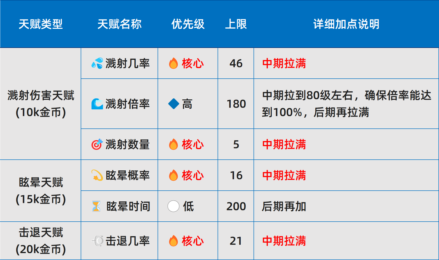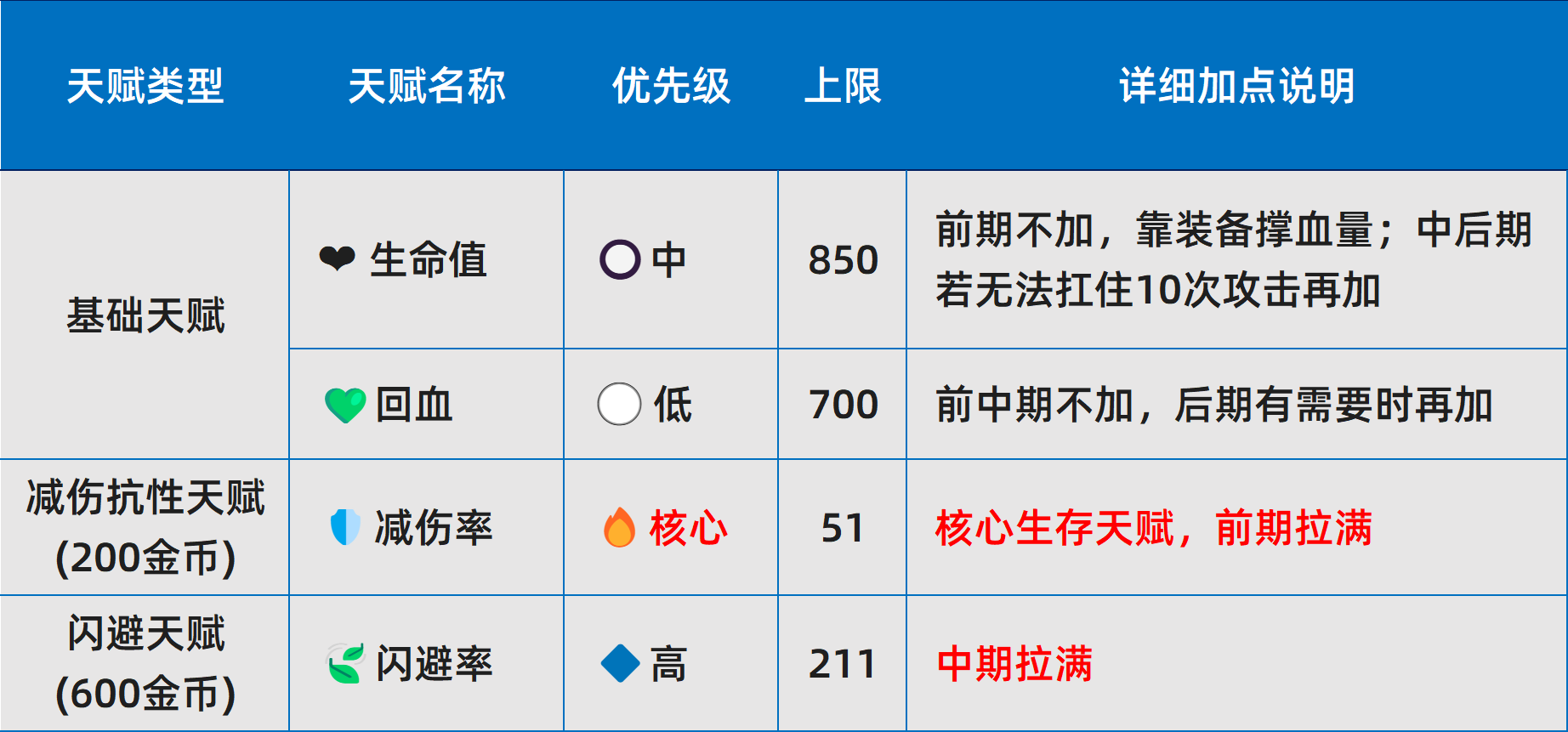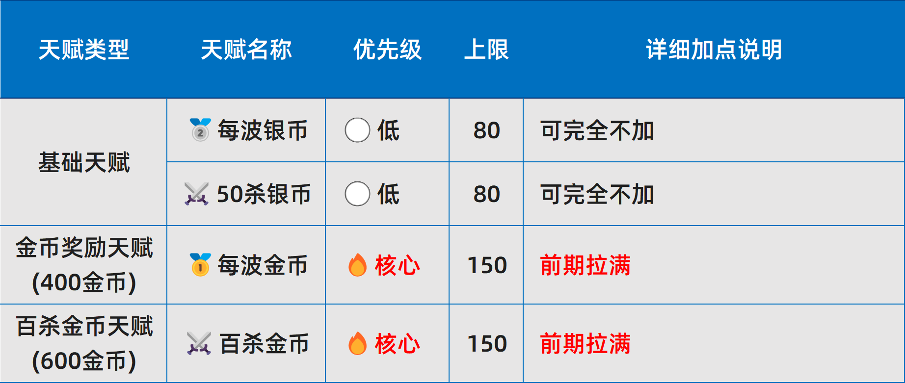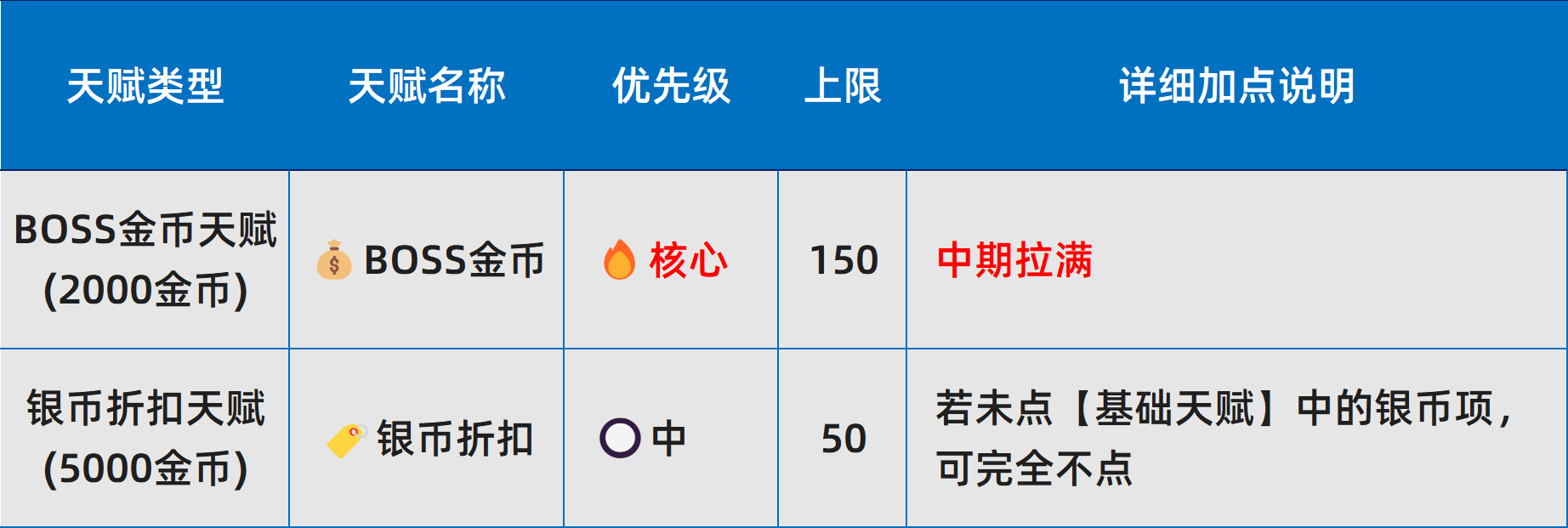 l 天赋重要性划分为四级:核心>高>中>低。其中,核心天赋在金币充裕时应优先完成满级;其余层级按需补充,不建议跨阶段提前投入。