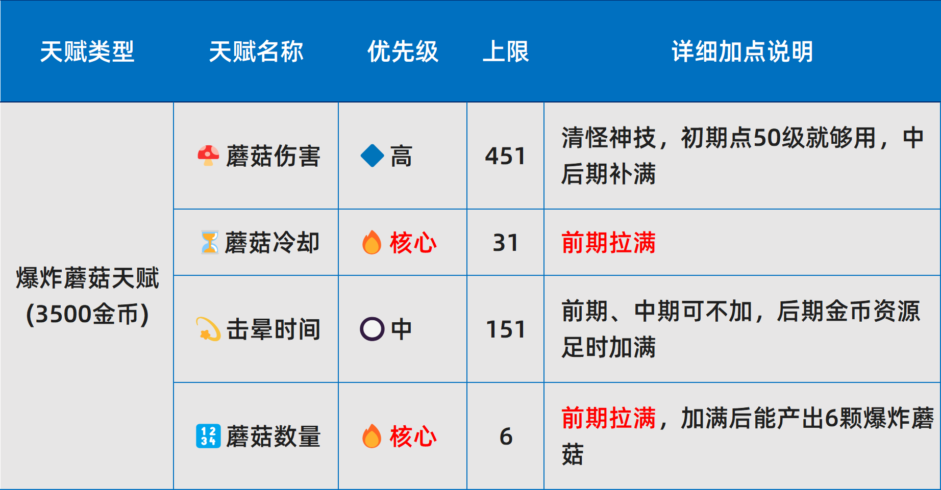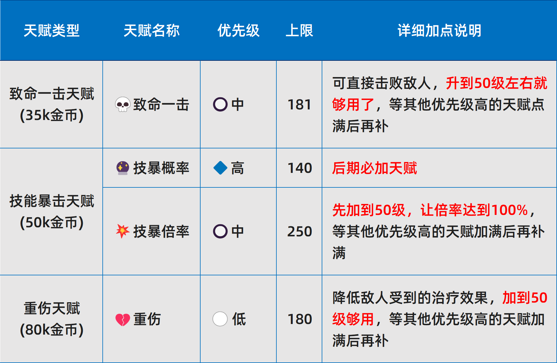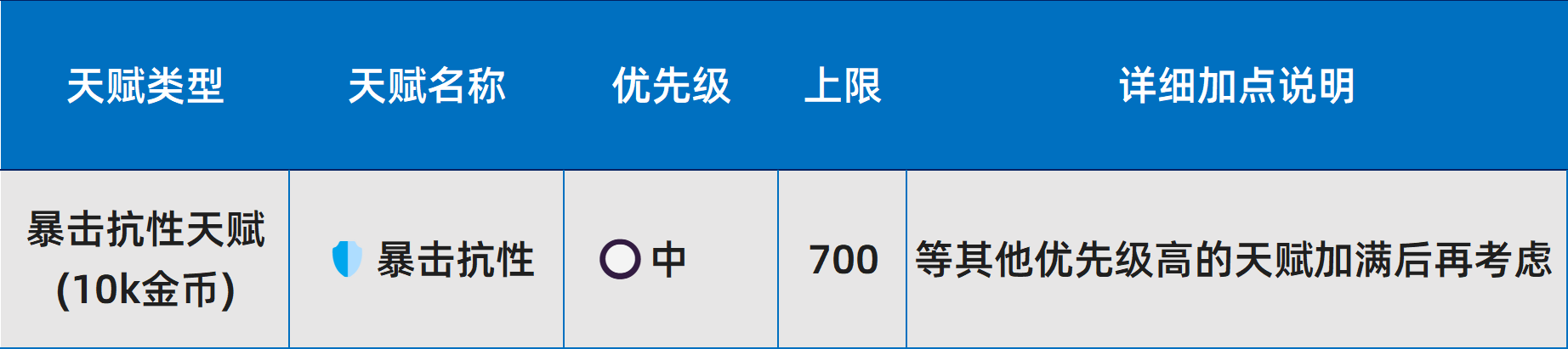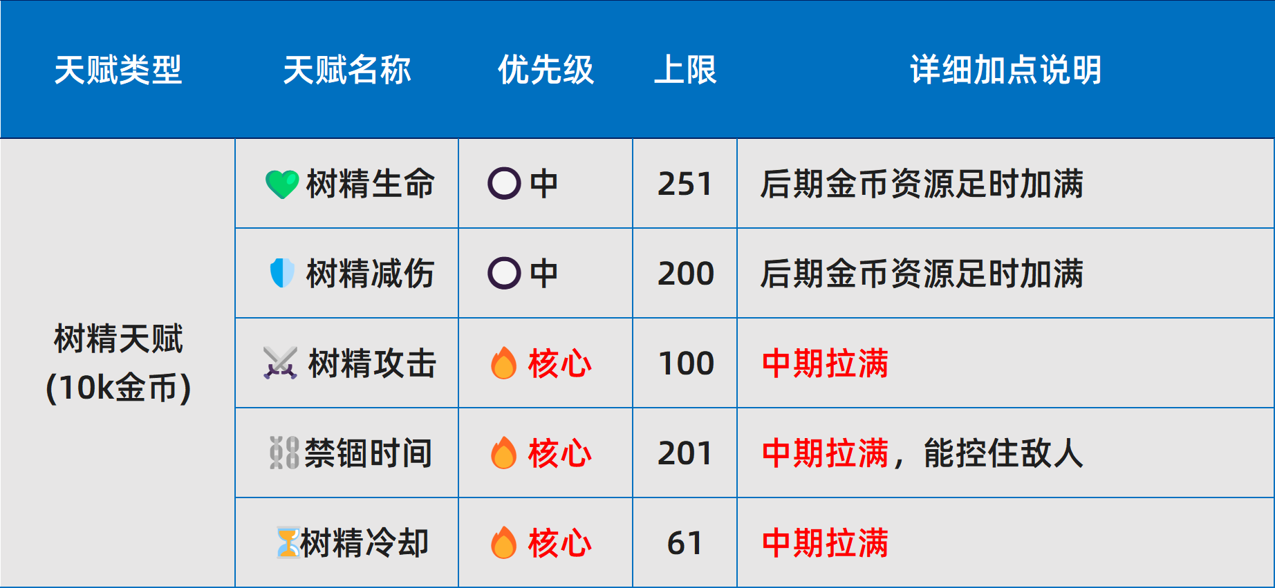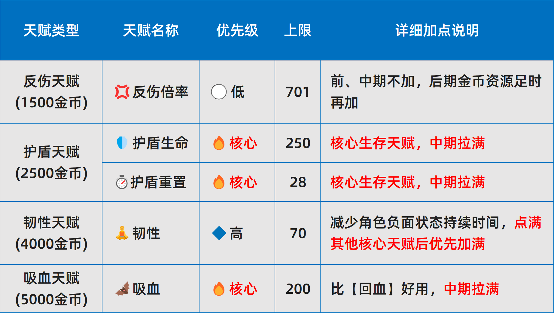 l 天赋重要性划分为四级:核心>高>中>低。其中,核心天赋在金币充裕时应优先完成满级;其余层级按需补充,不建议跨阶段提前投入。