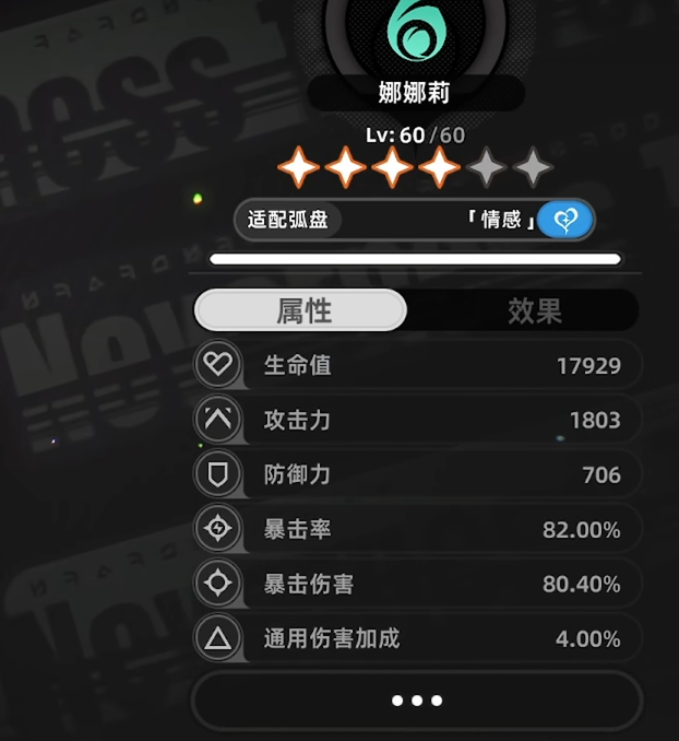 娜娜莉的基础属性设计突出双维优势:一方面拥有全角色梯队中领先的暴击率成长曲线,另一方面在生命值面板上亦高于同稀有度常规输出角色。其核心强度来源于两项机制协同——主动技能触发后可叠加高额暴击伤害增益,且普攻与重击衔接具备极短响应延迟,使爆发窗口的实际覆盖率显著提升。