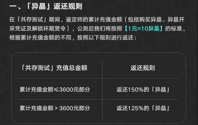 关于异晶返还:测试期间所有r民币充值,均按1元=10异晶的基础单位换算。其中,累计充值金额≤3600元的部分,按150%比例返还异晶;超出3600元的部分,则按125%比例返还。举例说明:若总充值5000元,则前3600元对应返还54000异晶,剩余1400元对应返还17500异晶,合计返还71500异晶。该机制确保大额投入仍享有较高回报率。